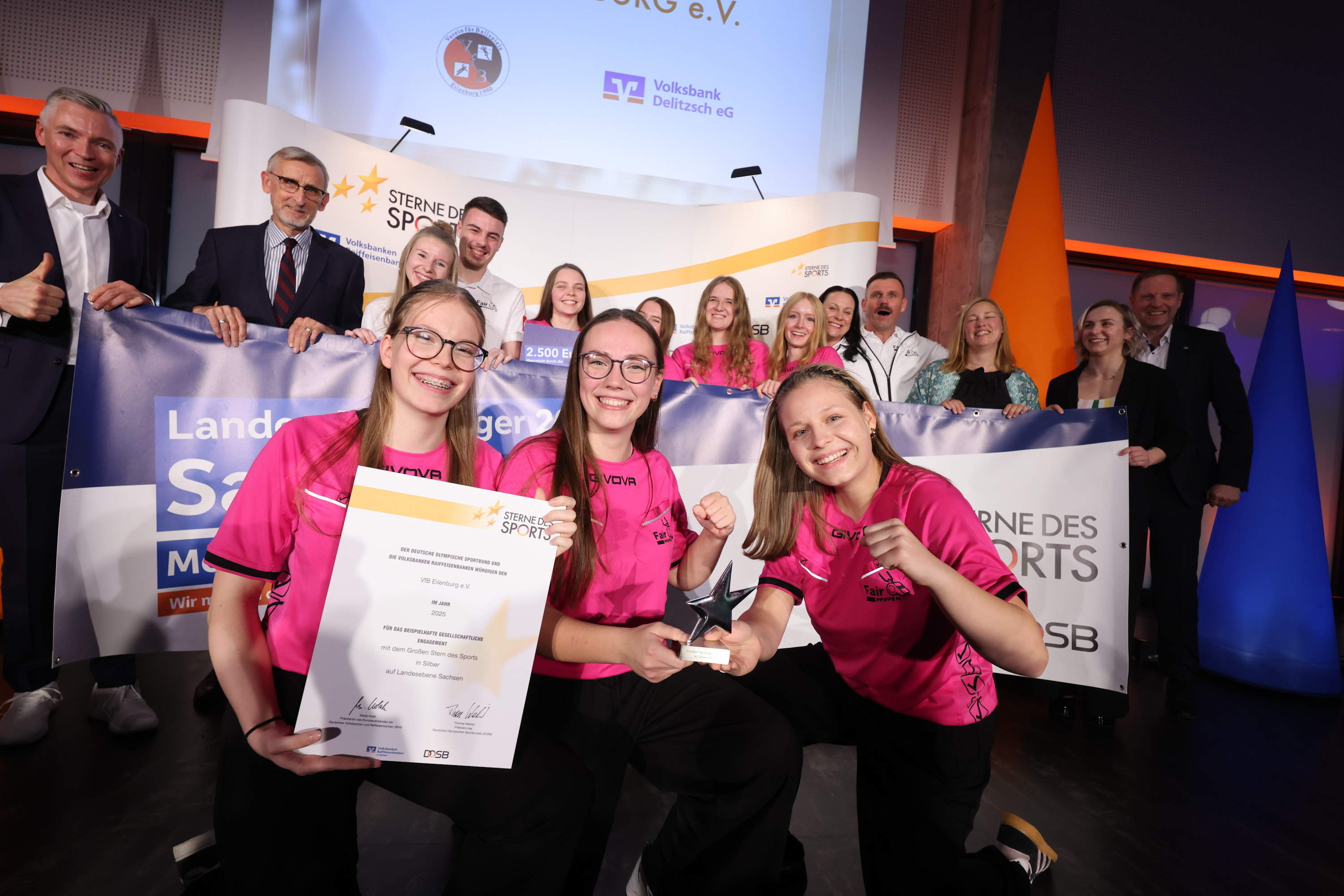 1. Platz/Großer Stern in Silber (2.500 Euro): VfB Eilenburg e.V. für das Projekt "FairPFIFFEN" begleitet von der Volksbank Delitzsch eG.